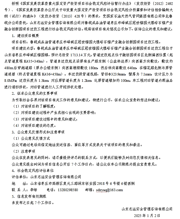 魯皖成品油管道棗莊市嶧城區冠世榴園大理峪石榴產業融合創新園項目遷改工程社會穩定風險評估征詢意見公示