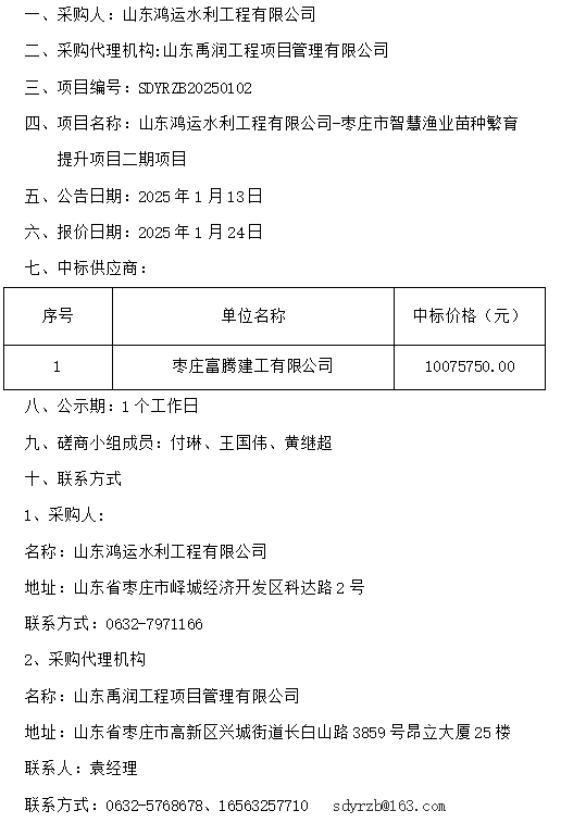 山東鴻運水利工程有限公司-棗莊市智慧漁業苗種繁育提升項目二期項目成交公示