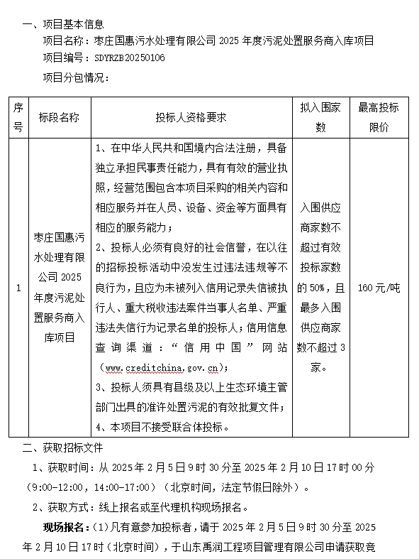 棗莊國惠污水處理有限公司2025年度污泥處置服務商入庫項目招標公告