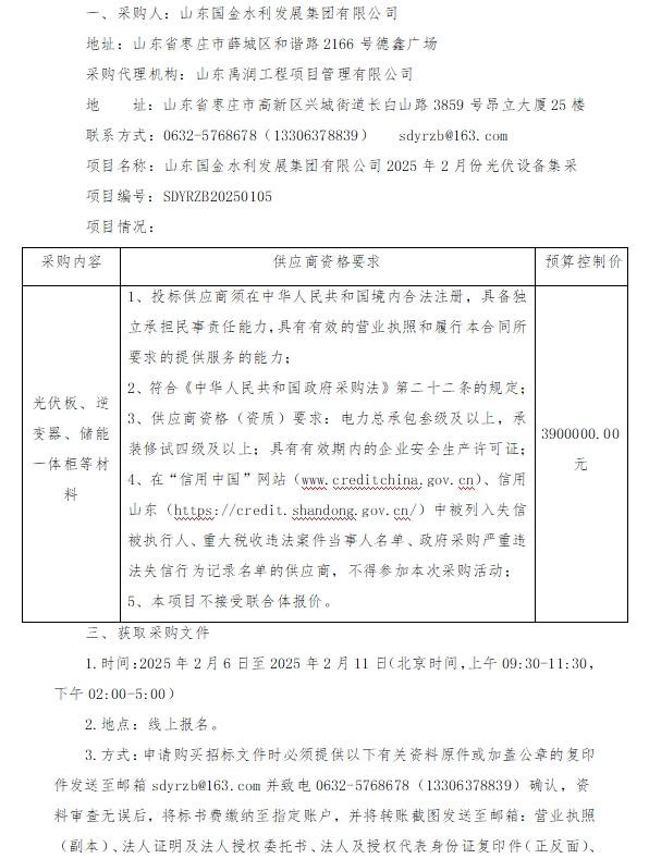 山東國金水利發展集團有限公司2025年2月份光伏設備集采競爭性磋商公告