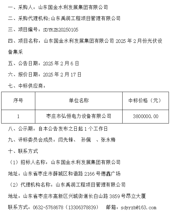 山東國金水利發展集團有限公司2025年2月份光伏設備集采中標公示